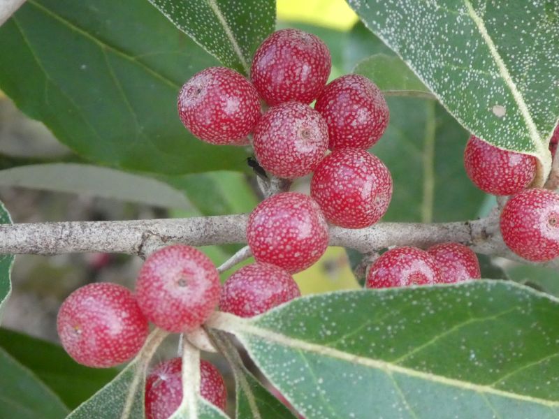 보리수나무는 3~4m가량 자라는 낙엽 지는 활엽 떨기나무입니다. 잎이 좀 독특한데요. 타원형의 잎 뒷면은 은백색 인모가 돋아나 있습니다. 이 나무는 가을이 되면 잎이 떨어지는 낙엽성 나무입니다. 잎이 지지 않는 상록성 보리수나무도 있는데 특이하게도 가을에 꽃을 피우고 이듬해 봄에 열매가 익습니다. 잎의 색에 따라 잎 뒷면이 하얀 쌀밥 같은 흰색이면 보리밥나무, 뒷면이 된장처럼 갈색빛이면 보리장나무라고 부릅니다. 이 늘푸른 상록성 보리수나무는 우리나라 남해안과 제주도에 주로 서식합니다.